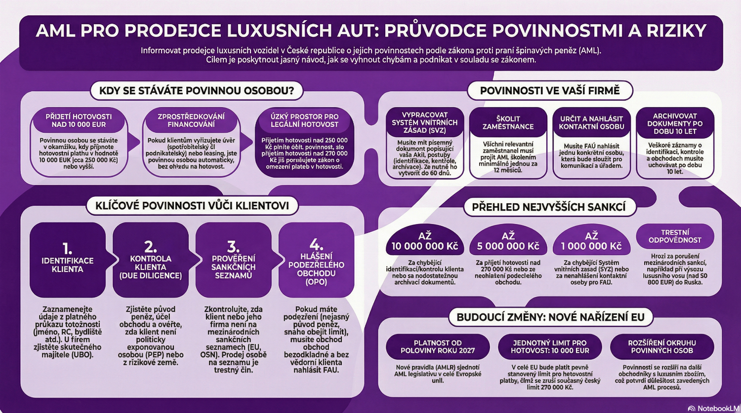 Pokud prodáváte luxusní automobily nebo je zprostředkováváte, možná si nejste vědomi, za jakých podmínek spadnete mezi povinné osoby podle AML zákona. Ignorování povinnosti identifikovat klienty a ověřit původ peněz vás může stát miliony v pokutách. V tomto článku vysvětlíme, kdy přichází AML povinnost a jak se vyhnout chybám, které kontroloři Finančního analytického úřadu (FAÚ) zjišťují.