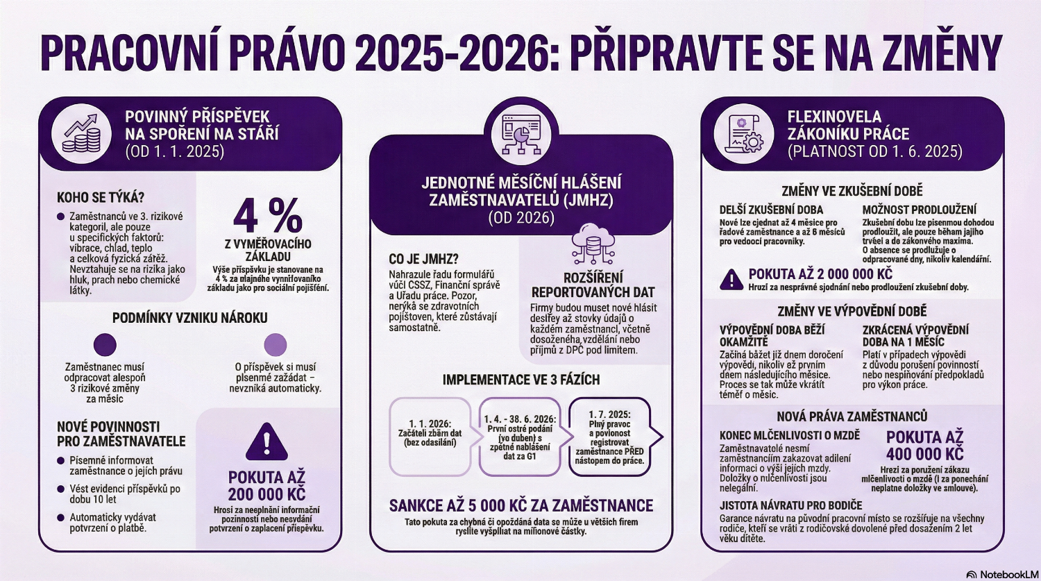 Rok 2026 přináší do pracovního práva několik změn, které zásadně ovlivní plánování HR procesů i rozpočty firem. V tomto článku najdete jasné vysvětlení toho, jaké povinnosti přináší příspěvek na spoření na stáří u rizikových profesí, jaké dopady má zavedení jednotného měsíčního hlášení a jak flexinovela mění pravidla pro zkušební dobu, výpovědi a vybraná práva zaměstnanců. Dozvíte se, jak tato pravidla ovlivní každodenní provoz a jak se na ně můžete připravit, abyste předešli sporům, sankcím a zbytečným nákladům.